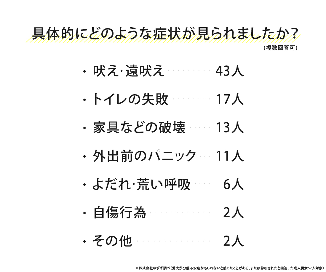 続いて先程のアンケートで、愛犬が分離不安症かもしれないと回答した57人に、『分離不安症で見られた症状はなんですか?』という質問をしました。