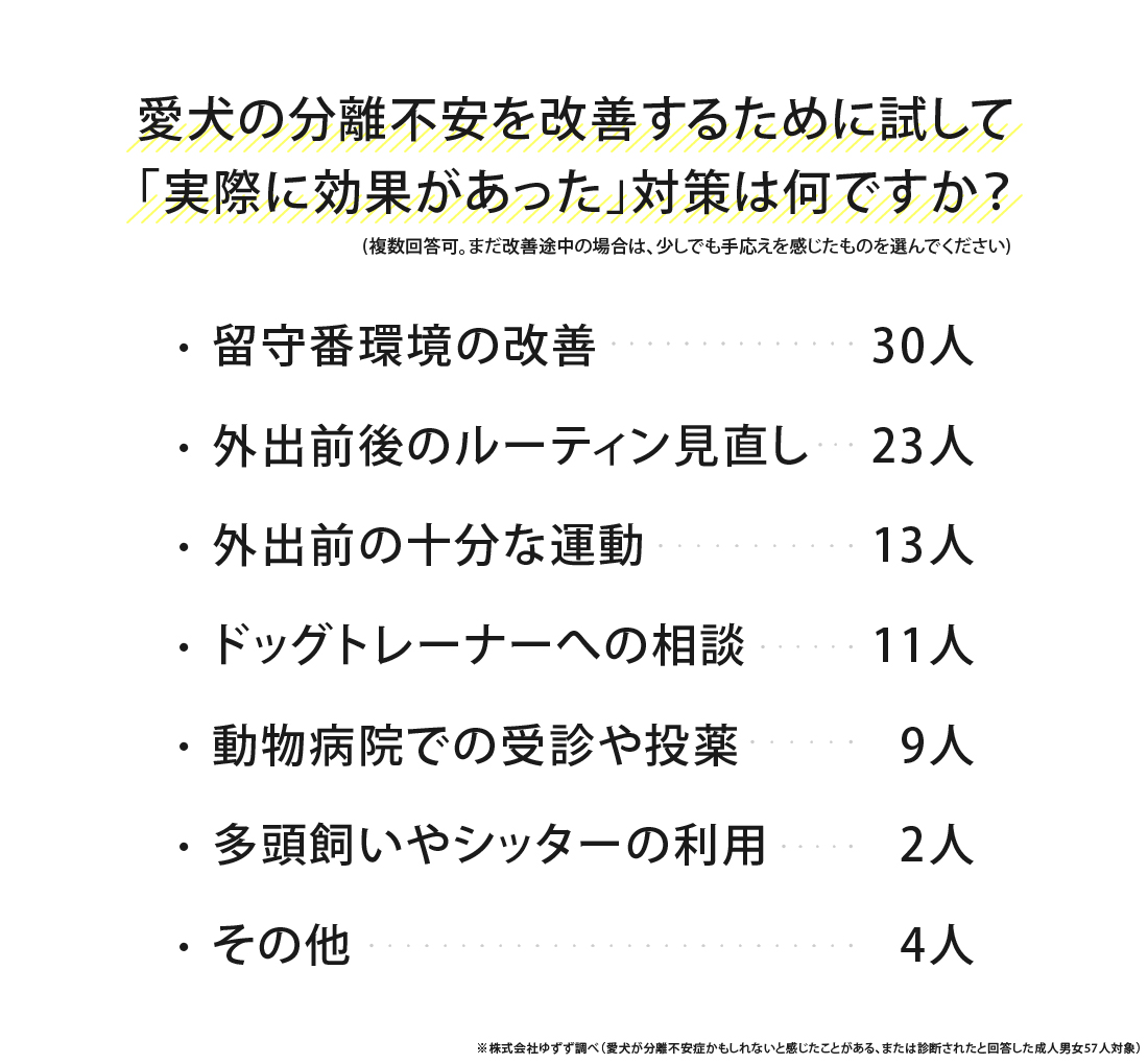 さらに、愛犬が分離不安症かもしれないと回答した57人に、『愛犬の分離不安を改善するために試して「実際に効果があった」対策は何ですか?』という質問をしました。