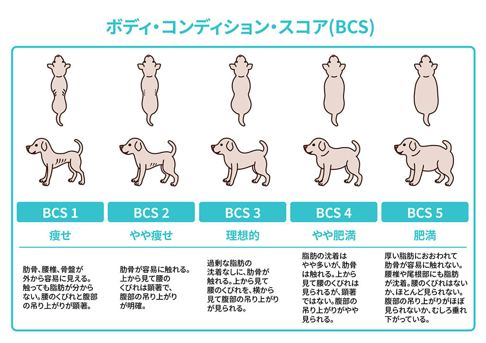 ボディ・コンディション・スコア(BCS)とは、犬が太っているか痩せているかを、見た目と触った感覚でチェックする方法です。