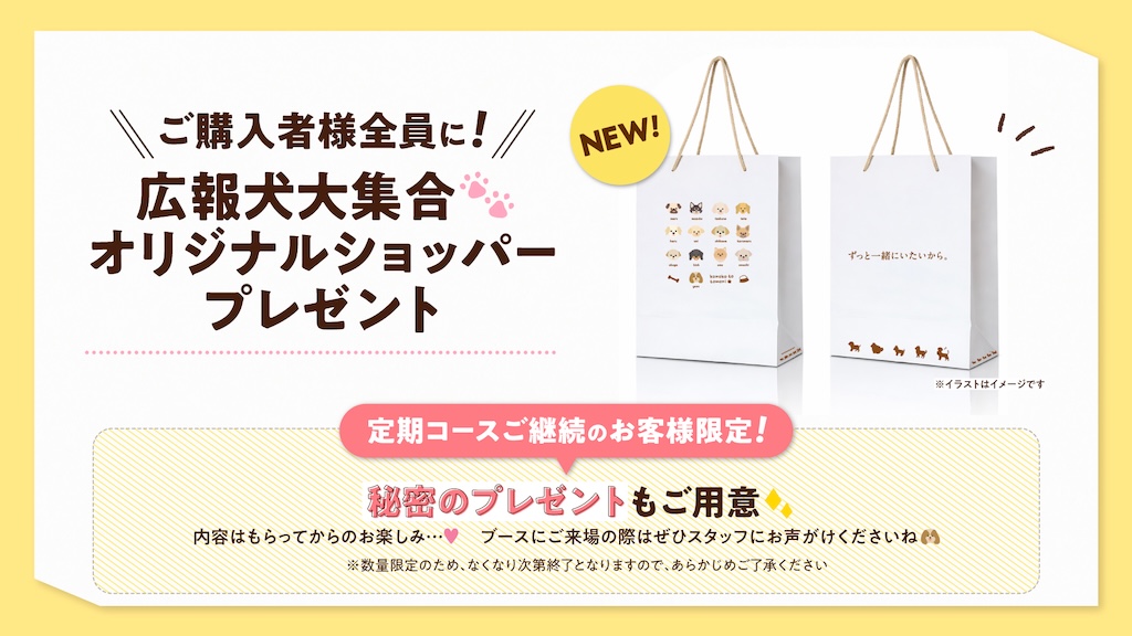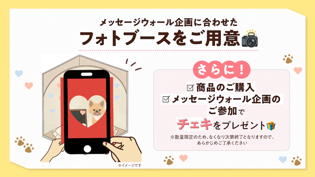 この企画に参加していただいた方で商品をご購入いただいた方には、フォトブースで撮影した愛犬との「チェキ」をプレゼントします。